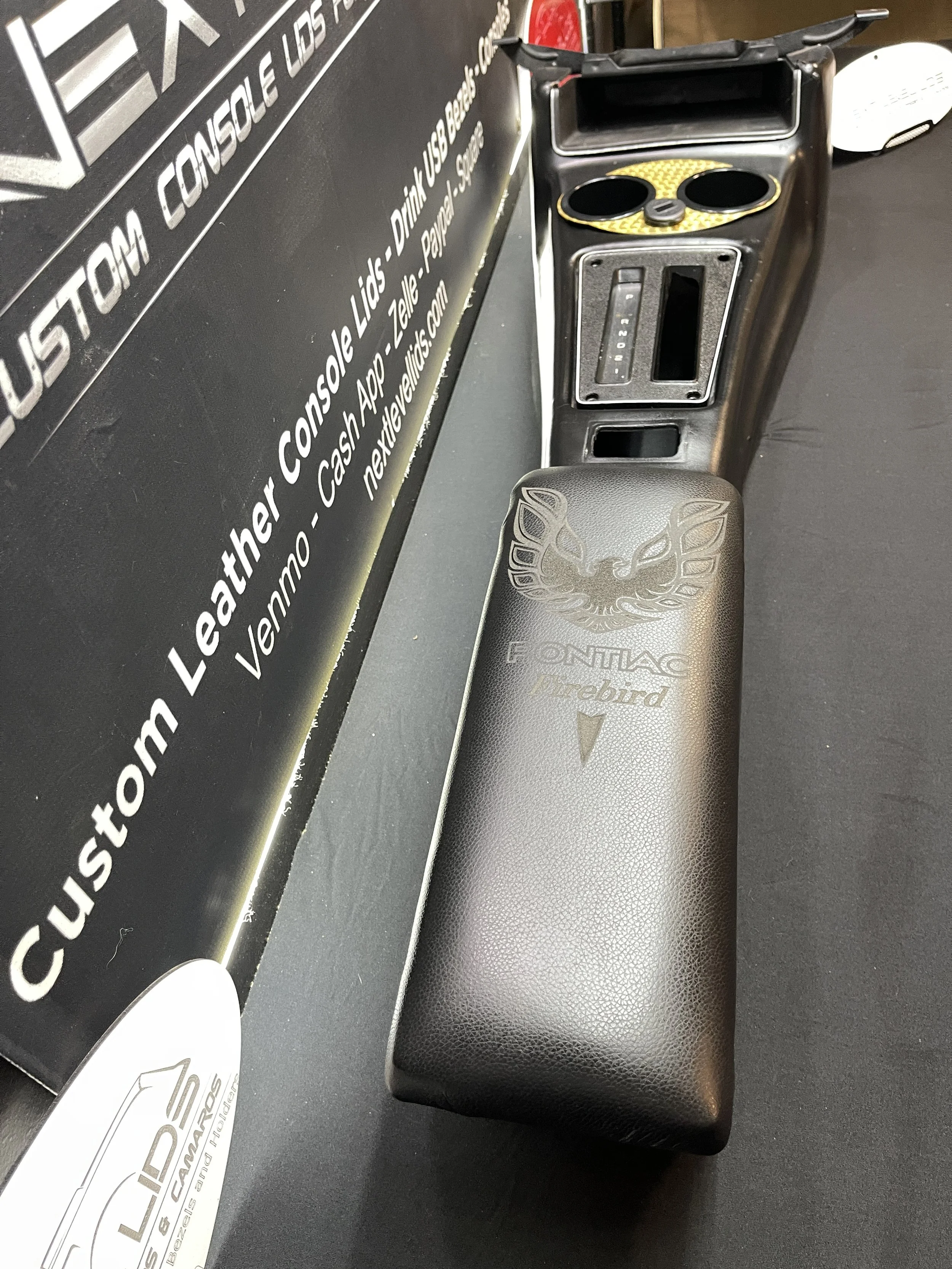 This Black center console comes with a custom leather lid and drink bezels. Unrestored grade B console, no major damage but could use a repair and respray or used as is.